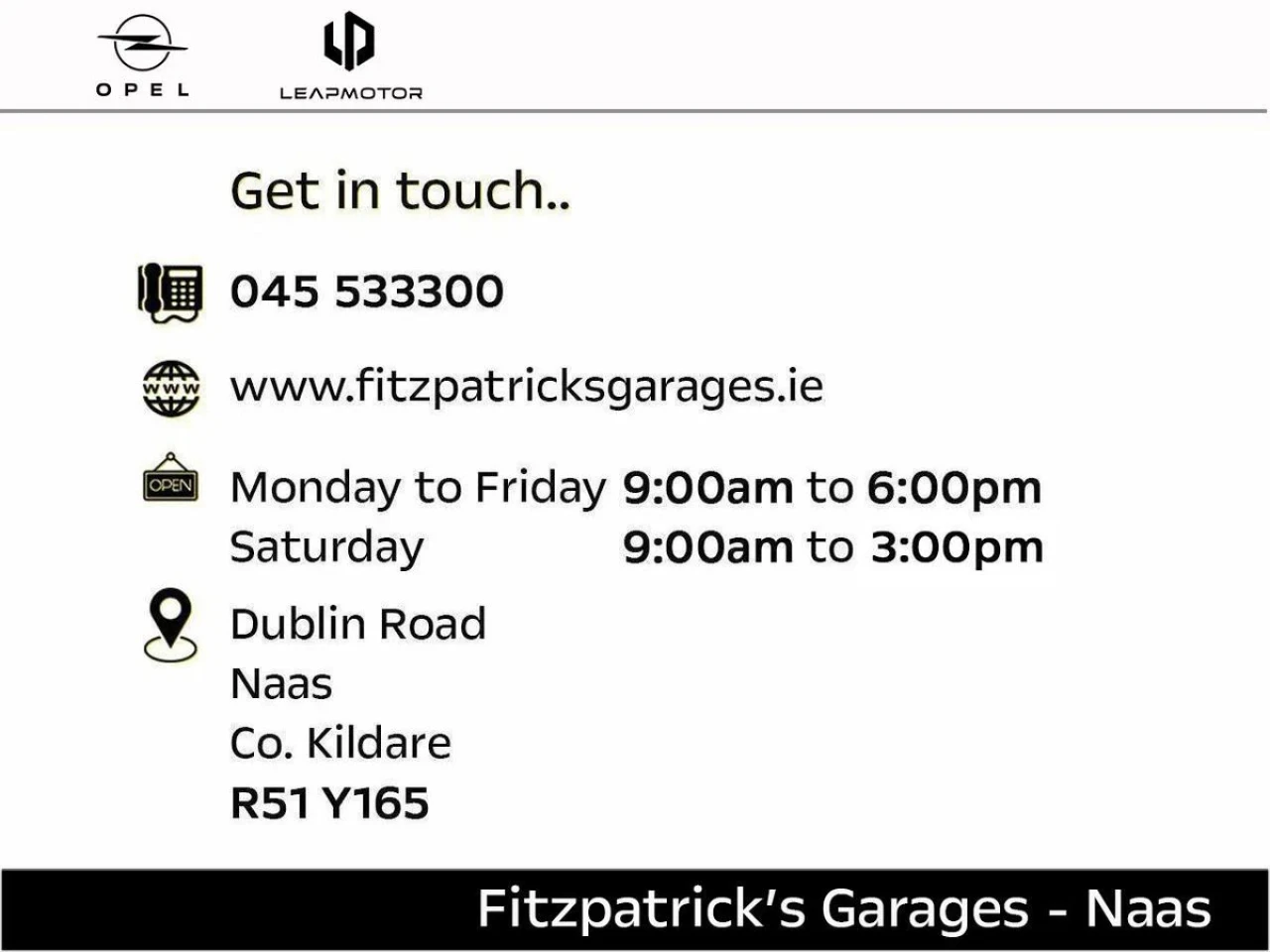 Demo with 3.9% Finance Available & Price Includes €1,000 Scrappage Allowance. Fitzpatrick’s Garage Naas – Your Award-Winning Home for Opel & Leapmotor With over 70 years of experience, Fitzpatrick’s Garages is proud to offer exceptional customer care and expertise. Whether you’re looking for a new or used car, our dedicated sales team is here to help every step of the way. Contact Shane or Florian today on (045) 875 800 Visit Us: Just 10 minutes from the M50 (Red Cow Interchange) – Exit 9 on the N7, Naas. Eircode: W91 H934 Sales Opening Hours: Monday – Friday: 9:00 AM – 6:00 PM Saturday: 9:00 AM – 3:00 PM
